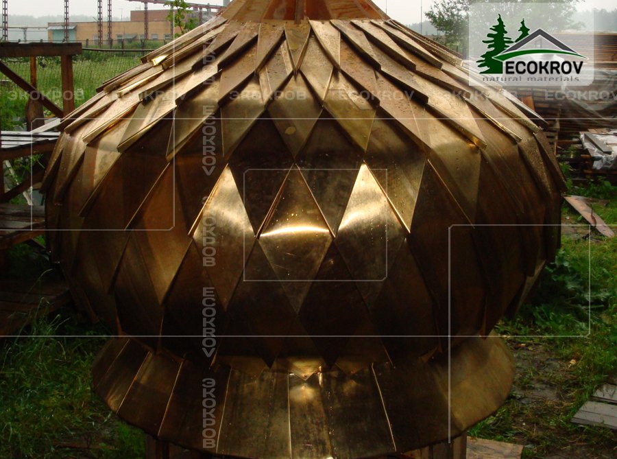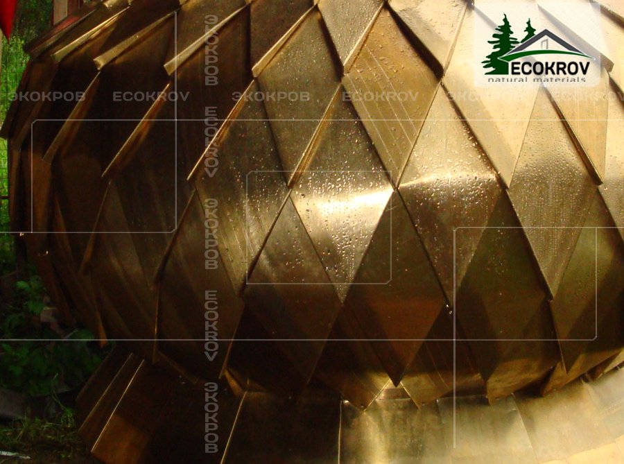 Круглый купол, покрытый кровельной шашкой переменного размера ромбовидной формы.