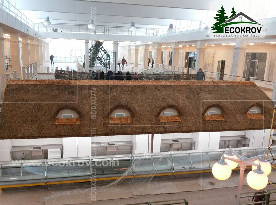 Монтаж стропильной системы и камышовой кровли площадью 60 кв.м. в зале торгового центра "Торговые ряды".