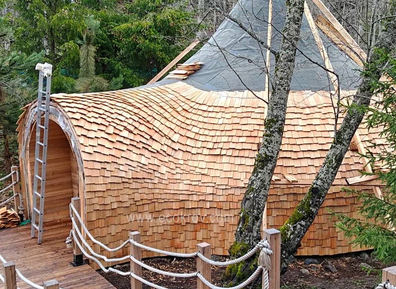 Основная сложность данного проекта заключалась в покрытии деревянной черепицей, строения, сферической формы и примыкающему к нему тамбуру. Плавности перехода разного направления рядового покрытия из черепицы Holzschindeln, монтажу дощечек разной длины и ширины в "дикую" укладку, с сводом ее на вершине в конус. Действительно очень сложная работа.