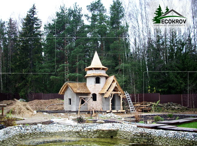 Устройство кровли декоративного домика из деревянной черепицы и камыша.